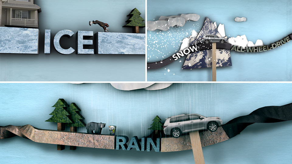 Created in Cinema 4D for a Toyota SUV Winter Weather campaign.